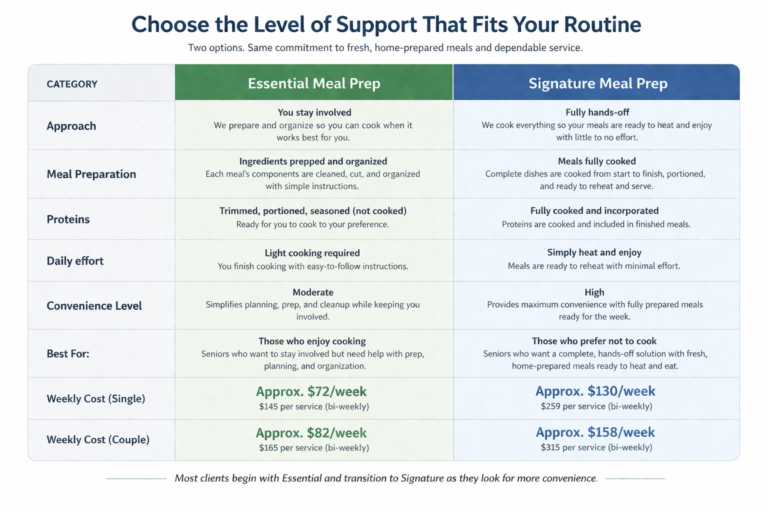 Our process is designed to do more than prepare meals—it’s built to help seniors stay independent through better nutrition and simple, practical cooking support. Each step is intentional, combining personalized service with guidance that makes daily meals easier, more consistent, and more enjoyable.